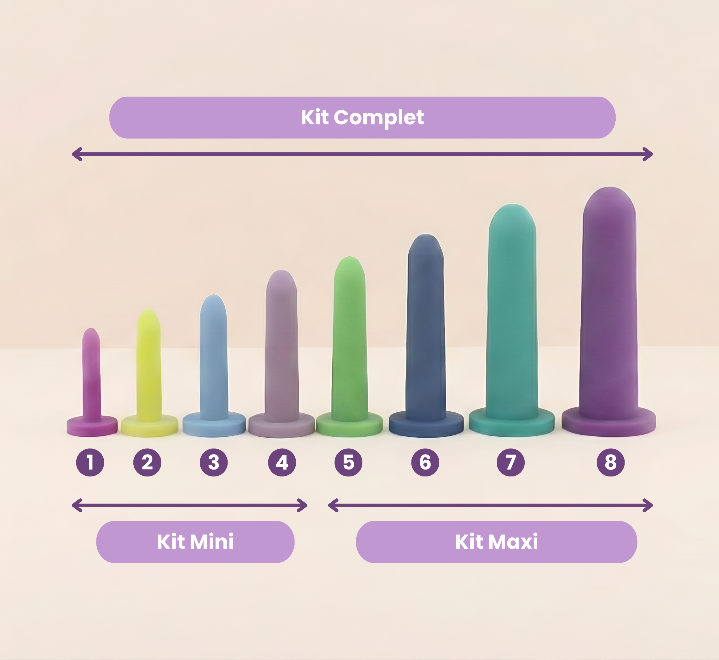 1) Le Kit Complet - comprend 8 dilatateurs, avec des diamètres allant de 1.2 cm à 3.7 cm